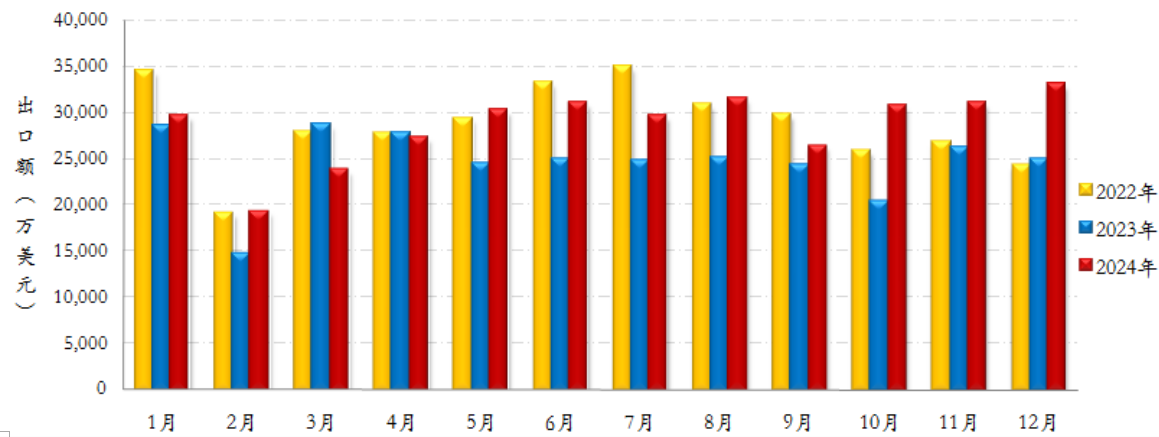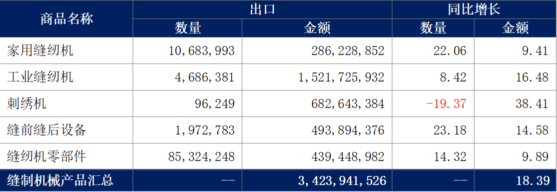 据海关总署数据显示,2024全年我国缝制机械产品累计出口额34.24亿美元,同比增长18.39%。其中,工业缝纫机出口量469万台,出口额15.22亿美元,同比分别增长8.42%和16.48%;刺绣机出口量9.6万台,同比下降19.37%,出口额6.83亿美元,同比增长38.41%;缝前缝后设备出口量197万台,出口额4.94亿美元,同比分别增长23.18%和14.58%。